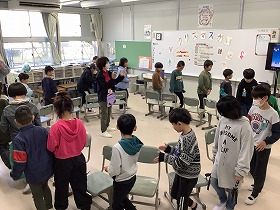 教室で朝の会終了後、担任の先生と一緒に新校舎に移動します。